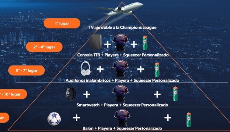 8vo al 10mo Lugar: Apple Watch Series 9 + 1 jersey marca Nike de algunos de los equipos de la UEFA Champions League + 1 Squeezer Gatorade.