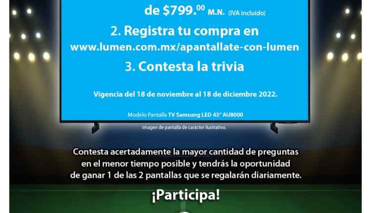 Realiza una compra con un valor mínimo de $799.00 de cualquier producto participante a través de https://lumen.com.mx/ o en cualquiera de las tiendas participantes Hiperlumen y Lumen dentro de la República Mexicana, con cualquier forma de pago entre el 18 de noviembre y el 18 de diciembre de 2022.