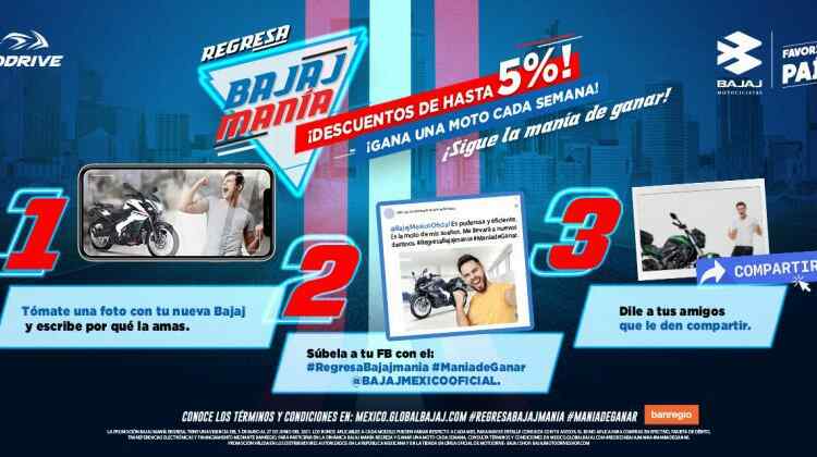 Tómate una fotografía con tu nueva moto Bajaj, súbela a tu perfil de Facebook de modo público, describe en la publicación por qué amas tu nueva Bajaj, etiqueta a @BajajMexicoOficial y agrega los hashtags #RegresaBajajMania y #ManiaDeGanar.