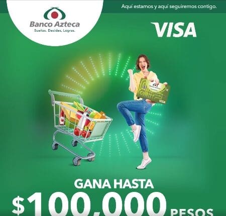 Compra $459 o más en supermercados con tu tarjeta de débito Visa de Banco Azteca y gana 1 de 100 premios semanales de $2,000 o $4,000 pesos al hacer tu súper y más