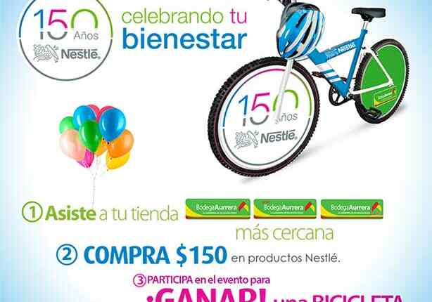 Bodega Aurrerá y Nestlé invitan al público a participar en su promoción Nestlé 150, en donde regalarán miles de bicicletas.