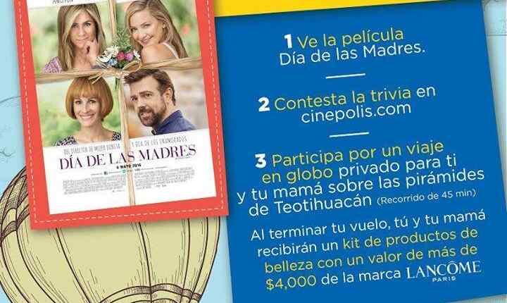 Cinépolis te invita a ver la nueva película “Dia de las madres” y a participar en este concurso en el que te podrás ganar un viaje en globo para mamá y además $4,000 pesos en productos de belleza Lancome.