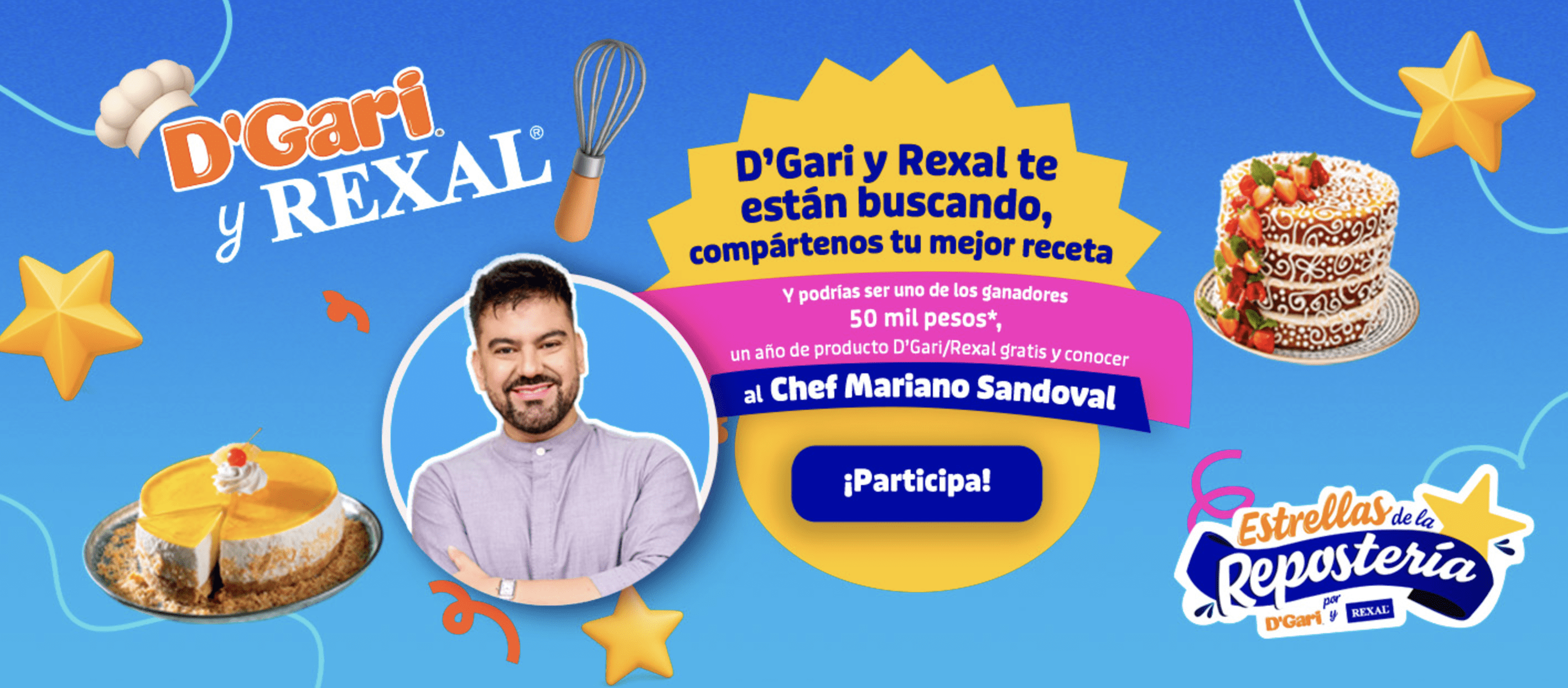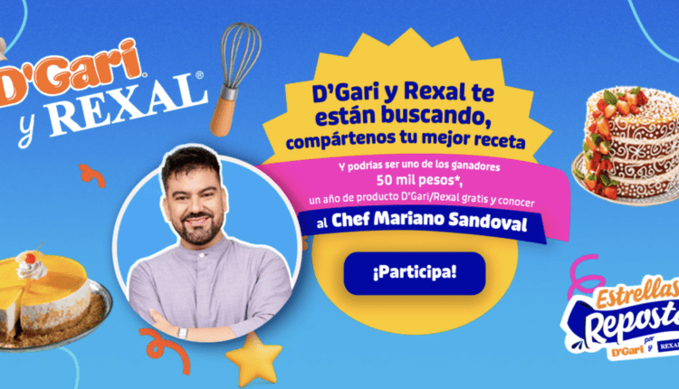 Ingresa al portal del concurso en https://estrellasdelareposteria.com y completa el formulario de registro, sube una fotografía en la que aparezcas junto a tu creación estrella de gelatina o pastel y cuenta por qué D’Gari o Rexal es tu aliado ideal en la repostería o qué es lo que más te gusta de D´Gari o Rexal.