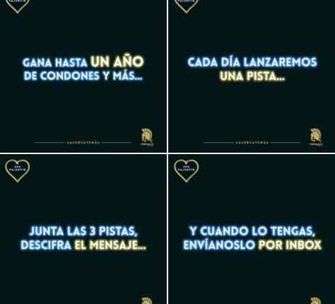 Ingresa a la página de Facebook de Condones Trojan y dale like, entre el 8 y el 13 de Febrero del 2017 Condones Trojan estará subiendo 3 pistas en su página de Facebook con las cuáles deberás descifrar un mensaje.