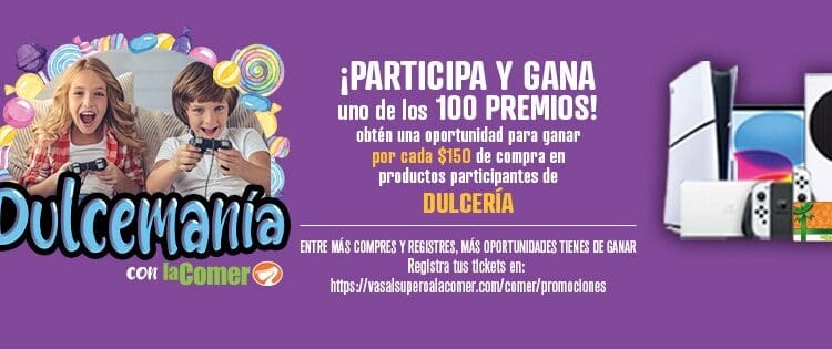 Realiza una compra de $150.00 en el departamento de Dulcería en La Comer entre el 1 y el 30 de abril de 2025, por cada $150.00 que compres en tu ticket aparecerá un código, guarda tus tickets de compra ya que de resultar ganador te serán solicitados para recoger tu premio.