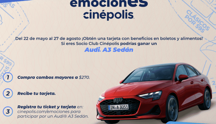 Cinépolis te invita a participar en su concurso EmocionEs Cinépolis 2025 en el que podrás gana un auto Audi A3 Sedán, si quieres ser ganador realiza la mecánica siguiente: