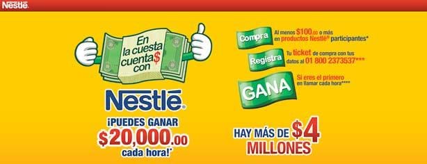 - Nestlé presenta su nueva promoción de inicio de año En la Cuesta Cuenta con Nestlé, con la que podrás ganar $20,000 pesos cada hora durante la vigencia de la promoción.