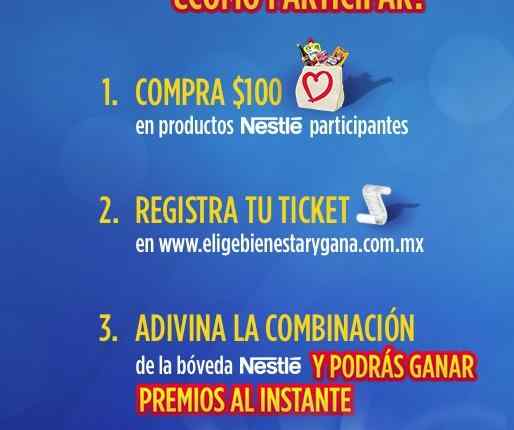 Realiza una compra mínima de $100.00 de productos Nestlé en HEB y conserva tu ticket de compra, ingresa a https://www.eligebienestarygana.com.mx/heb y completa el formulario con tu nombre completo, correo electrónico, teléfono, ticket y Estado