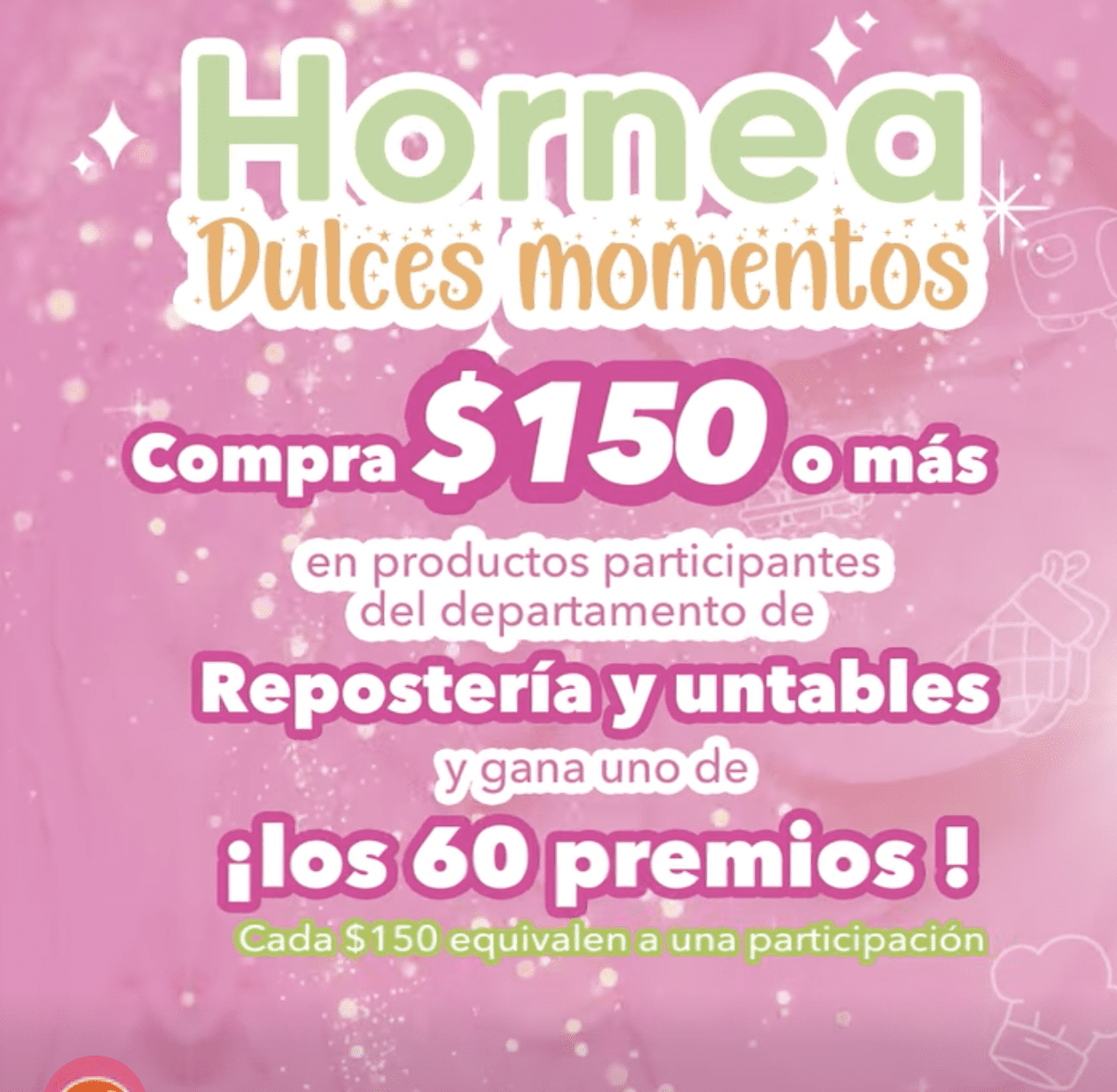 Realiza una compra de $150.00 de productos participantes dentro de las categorías de repostería, mermeladas, cajetas, cremas de cacahuate y avellanas en La Comer entre el 1 y el 31 de octubre de 2025. Por cada $150.00 que compres en tu ticket aparecerá un código, guarda tus tickets de compra ya que de resultar ganador te serán solicitados para recoger tu premio.