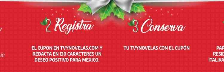 Compra tu revista TvyNovelas en la edición 3946 a la 3950 que corresponde a los meses de Novienbre y Diciembre, entra a la página web de TvyNovelas y registra el cupón que viene dentro de la revista en la sección que dice “Registra cupones” y narra una historia de entre 120 y 200 caracteres donde narres un deseo navideño a favor de México