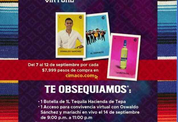 Realiza compras de $7,999.00 en la tienda en línea de Cimaco en www.cimaco.com entre el 7 y el 12 de septiembre de 2020. Con tu compra te llevarás la botella de tequila y acceso a la Noche Mexicana