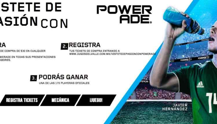 Realiza una compra mínima de $30.00 de productos Powerade en cualquier presentación y cualquier sabor en tiendas Oxxo y conserva tu ticket de compra, ingresa a http://www.jugosdelvalle.com.mx/vistetedepasionconpowerade/public/iniciar-sesion y registra tus datos de contacto: Nombre completo, domicilio completo, correo electrónico, fecha de nacimiento y género y tu ticket de compra