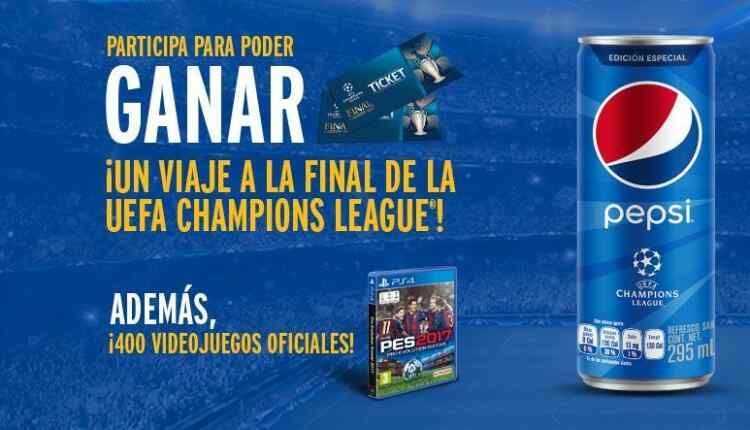 Participa en la promoción Pepsi Champions League 2017 y podrás ganar uno de los 400 videojuegos PES 2017 y hasta un viaje a la final de la UEFA Champions League 2017 en Cardiff.