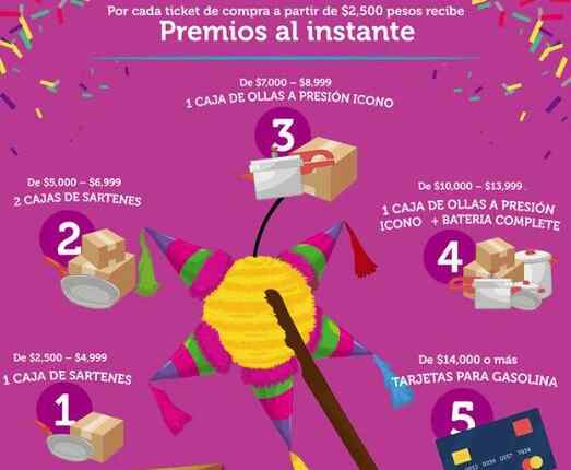 Realiza compras mínimas de $2,500.00 en productos Cinsa o Santa Anita en cualquiera de las tiendas participantes (Copelsa, Surtidora RJ, Casa Ahued o La Única) y obtendrás al instante algui de los premios a otorgar según el monto de compra: