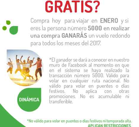 Compra un vuelo para viajar en Enero, si eres la persona numero 5000 gana 1 vuelo redondo todos los meses de 2017