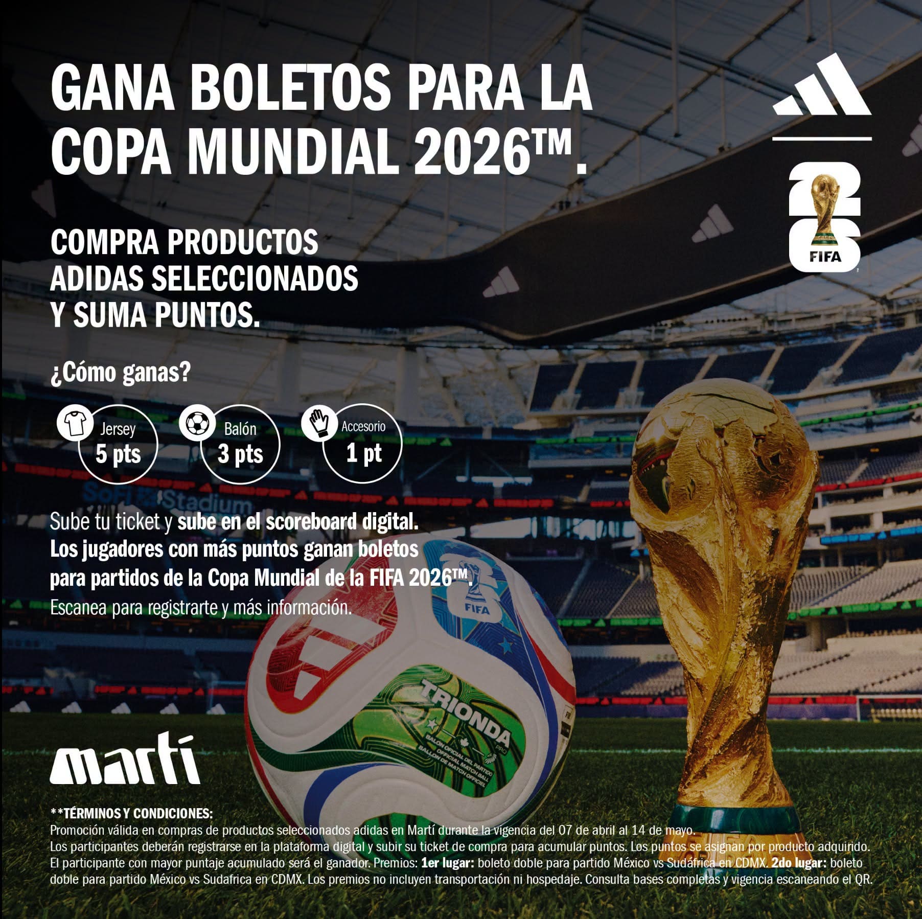 adidas y Marti te invitan a participar a su concurso en el que podrás ganar boletos para la Copa Mundial 2026, si quieres ser ganador realiza la mecánica siguiente: