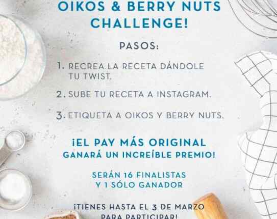 Para la elaboración de la receta es necesario utilizar productos de la marca Oikos y BerryNuts que se mencionan en la receta. En la descripción del vídeo tendrás que usar el hashtag #BerryOikos. Los vídeos deberán ser creativos y originales, pues los 16 más originales y creativos que cumplan con los requisitos avanzarán a la siguiente ronda para tener la oportunidad de ganar.