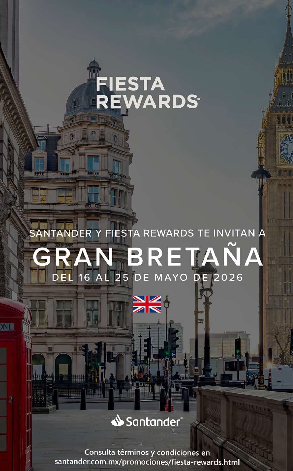 Santander y Fiesta Rewards te invitan a participar a su concurso en el que podrás ganar un viaje doble a Londres y Edimburgo, si quieres ser ganador realiza la mecánica siguiente: