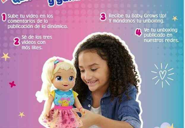Juguetron regalará a los participantes ganadores: 1 muñeca Baby Grows Up de Baby Alive para cada ganador y que el video de unboxing que hagan con su nueva muñeca sea publicado en las redes sociales de Juguetron.