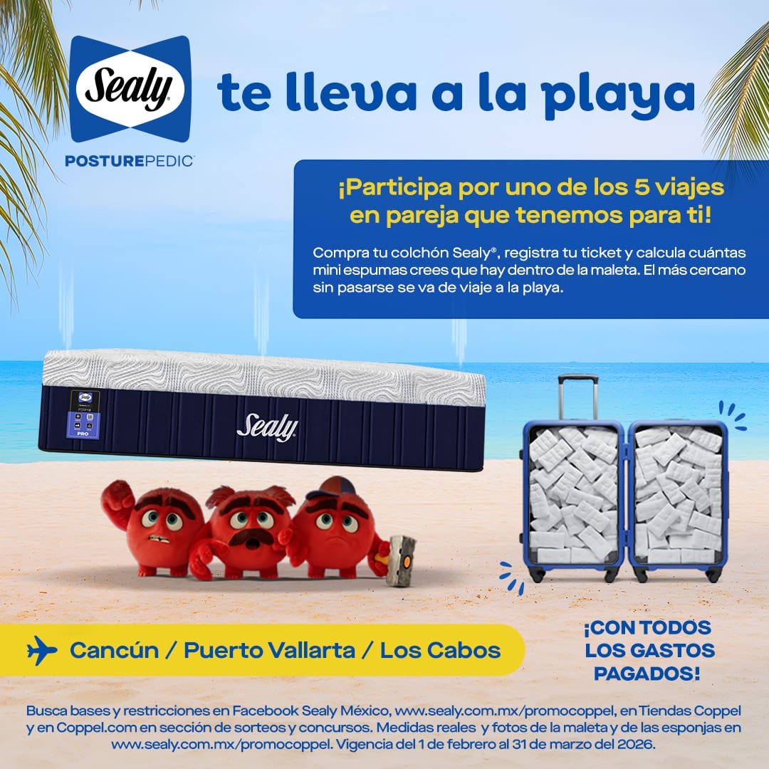 Realiza la compra de un colchón y/o juego de colchón con box de la marca Sealy en cualquiera de las tiendas Coppel de la República Mexicana o a través de Coppel.com, entre el 1 de febrero y el 31 de marzo de 2026 y conserva tu ticket de compra. Por cada compra válida, obtendrás una oportunidad de participación.
