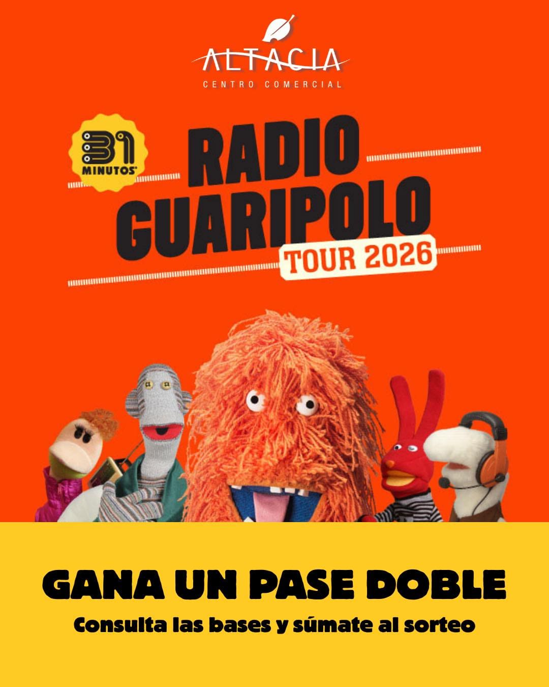 Centro Comercial Altacia te invita a participar a su concurso en el que podrás ganar un pase doble para el tour 2026 Radio Guaripolo de 31 Minutos, si quieres ser ganador realiza la mecánica siguiente: