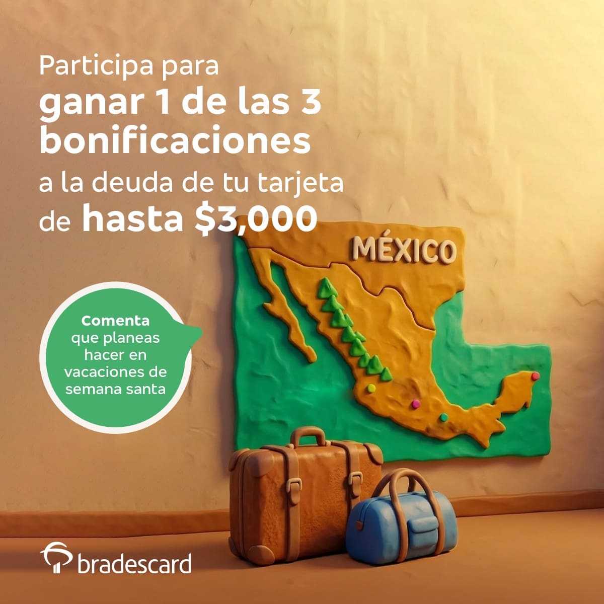 bradescard México te invita a participar a su concurso de Semana Santa en el que podrás ganar 1 de 3 bonificaciones de $3,000.00, si quieres ser ganador realiza la mecánica siguiente: