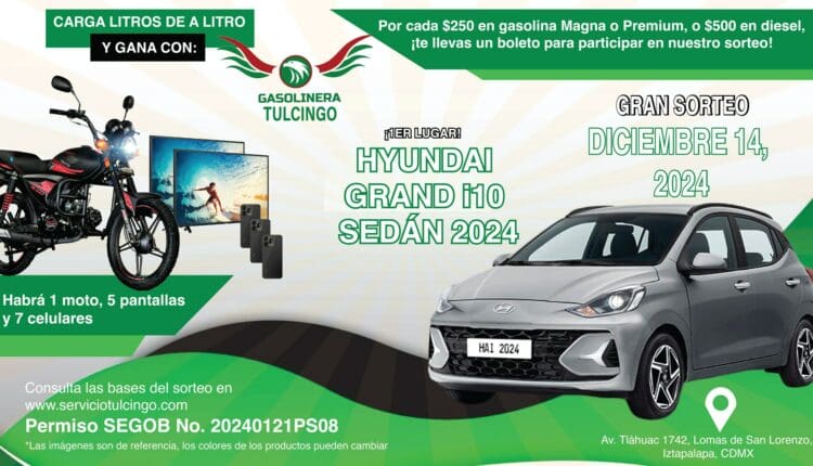 Carga litros de a litro de Servicio Tulcingo en Av. Tláhuac 1742, San Lorenzo Tezonco entre el 15 de junio y el 14 de diciembre de 2024, por cada $250.00 de compra en gasolina magna o premium o por cada $500.00 de compra en combustible diésel en el establecimiento mencionado, recibirás un boleto para participar en el sorteo, solicita tu boleto el día de la compra y deposítalo en la tómbola ubicada en el domicilio antes mencionado dentro del horario y fechas de distribución de boletos.