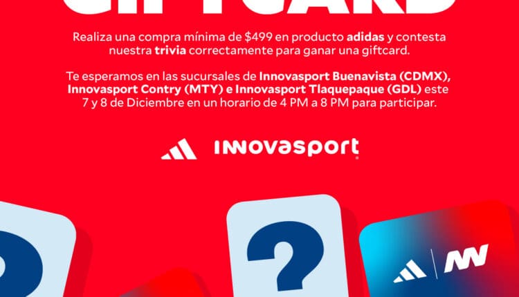 Realiza una compra mínima de $499.00 en productos adidas y tendrás el derecho a participar en la trivia y llevarte una giftcard. Podrás participar este 7 y 8 de diciembre de 2023 en las siguientes sucursales Innovasport, en un horario de 16:00 a 20:00 horas.