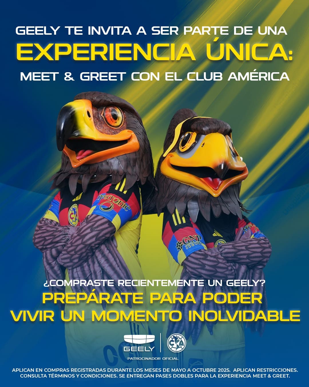 Geely Auto Mexico regalará a los participantes ganadores: Un pase doble para un Meet & Greet con el Club América. Cada pase doble incluye una experiencia exclusiva con 3 futbolistas del primer equipo varonil del Club América, en el Club América en las instalaciones de Coapa.