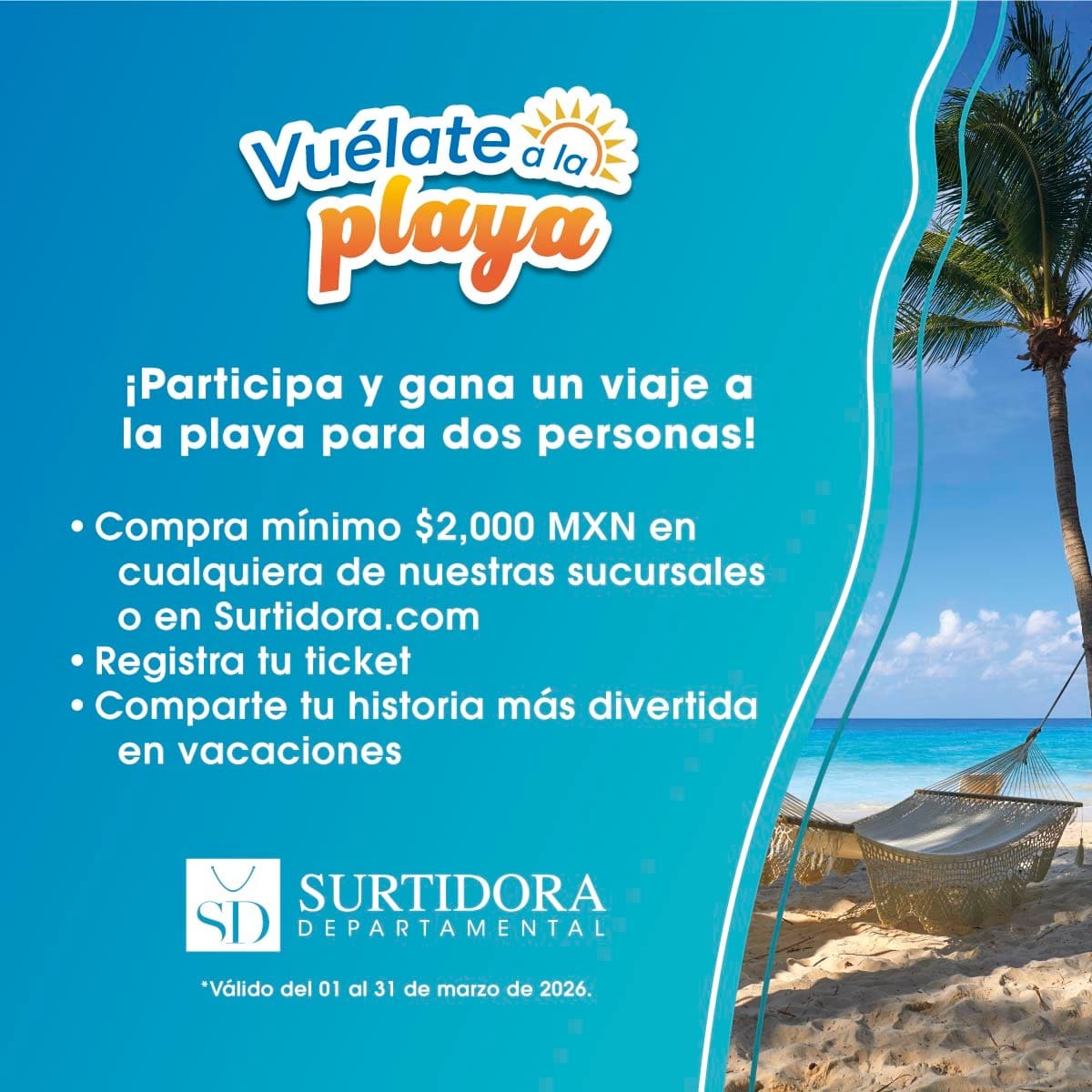 Surtidora Departamental te invita a participar a su concurso Vuélate a la Playa en el que podrás ganar un viaje a la playa para 2 personas, si quieres ser ganador realiza la mecánica siguiente: