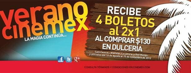 Compra $130 en dulceria y obtén 4 entradas al 2X1 en Cinemex