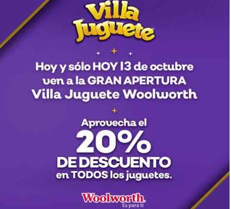 En Woolworth 20% de descuento en TODOS los juguetes sólo hoy 13 de octubre por la apertura de la Villa Juguete